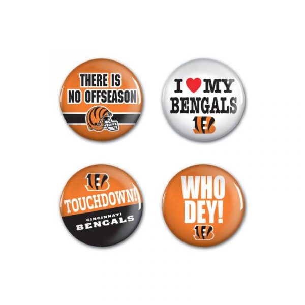 Licensed Cincinnati Bengals Button Pack can be used for many occasions! Fasten these to you bookbag, purse, jacket or hat. Put these in a prize package or gift basket. Officially licensed button set of small 1 1/4″ buttons are ideal for groups, parties with sports themes, or for daily display. Buttons come with a safety pin back.