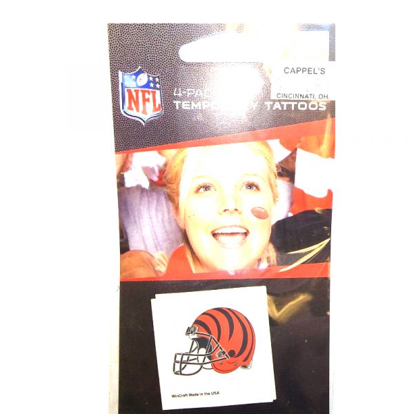 Licensed Cincinnati Bengals Temporary Tattoos. Removes easily with baby oil or rubbing alcohol. 4 tattoos per package.