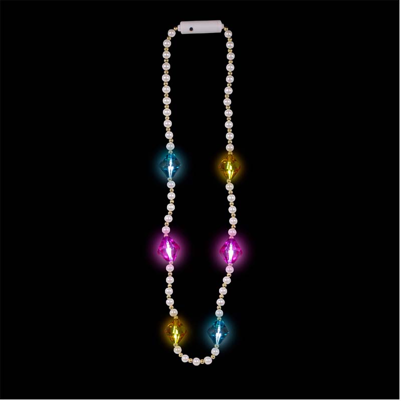Wear a Light-up Diamonds Pearl Bead Necklace to celebrate Mardi Gras or New Years Eve! Batteries included! Press the button to change functions. Flashing fast, slow, or blinking lights.