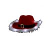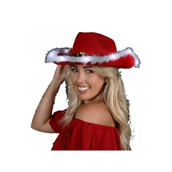 Wear Light Up Felt Western Santa Hat w Fur Trim this for Halloween, night clubs, music festivals, western themed parties, gala events, SantaCon, theatrical performances, and more. Buy this for all types of Christmas parties. This sturdy LED Christmas western hat is perfect for celebrating the holidays in style. Bright LED lights show through the white trim.