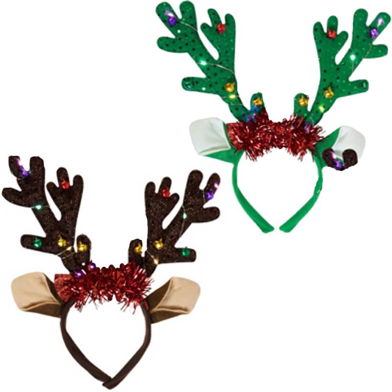 Light Up Reindeer Antlers with Bells are great for getting in the holiday spirit. They have tinsel along the base of the antlers, adding an extra touch of fun. Wear these to church, school, the office or at a house party. These are great for any event!