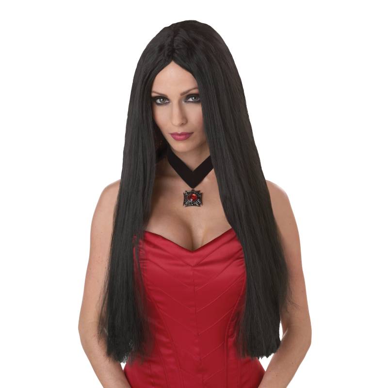 Long Flowing Black Morticia Addams Wig. According to Charles Addams himself, Morticia is “the real head of the family … low-voiced, incisive and subtle, smiles are rare…ruined beauty … contemptuous and original and with fierce family loyalty … even in disposition, muted, witty, sometimes deadly …”. Wear this wig for other costumes as well. Buy this for Halloween, drag, plays, cosplay, theatrical productions, and themed parties throughout the year.