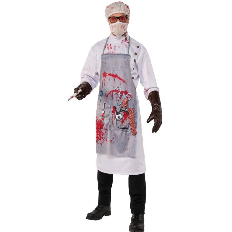 Mad Scientist Adult Costume comes with all the accessories necessary for a bloody good time. The coat is light weight and made from soft material. The apron is attached and ties around your waist for a custom fit. It has one pocket that has partial intestines attached; perfect for wallets and cell phones. It velcros shut in the back.