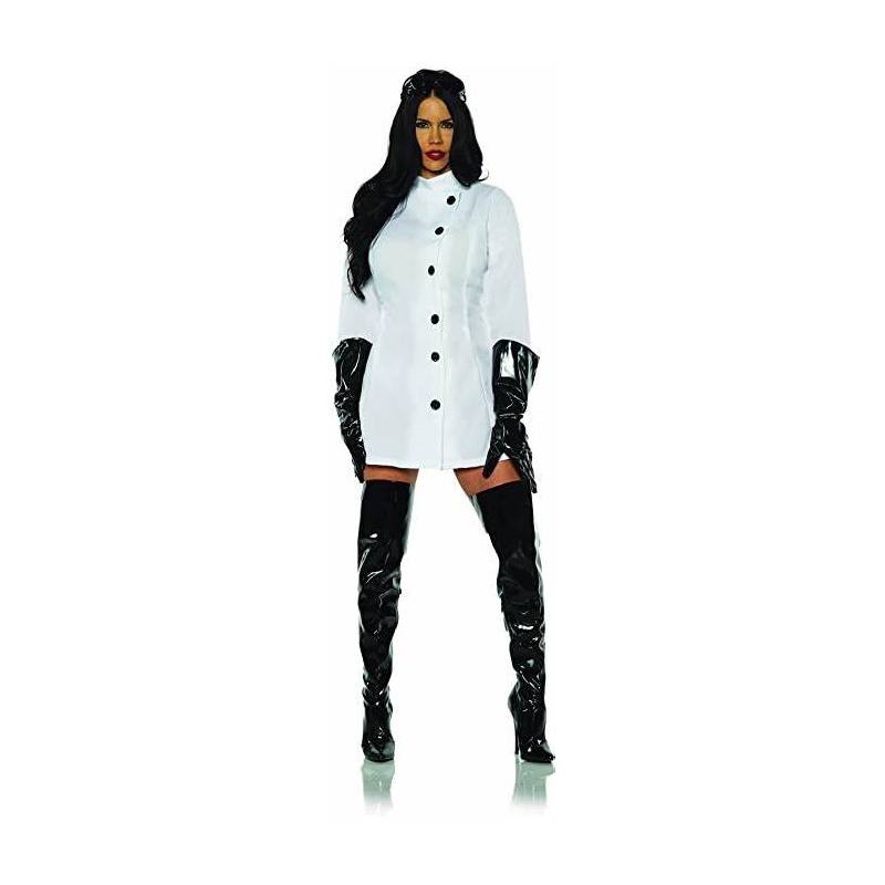 Mad Scientist Lady Dress is sexy and ready to wear for Halloween, theatrical productions, reenactments, cosplay, drag, school plays, themed parties and more. It comes in 4 different lady’s sizes. This is a mini dress with a hem line just above the knee. It has black buttons going down the front and 3/4 sleeves.