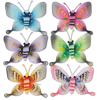 Majestic butterflies. Nothing says spring or summer time like butterflies. Decorate your spring fling and summertime bash with Majestic Butterflies. These come in one per package and measure 5 inches. These beauties come in a variety of style and color and are especially relevant to any spring fling.