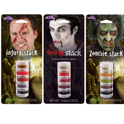 Everything you need for making up your face in character – Your choice of Zombie, Vampire, and Injury makeup kits all stacked together!