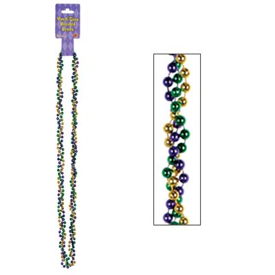 Mardi Gras Braided Beads. Wear these as an interesting “twist” to celebrate the coming of ash Wednesday. These are three round-beaded strings- one gold, one green, and one purple braided together to make one beaded necklace.