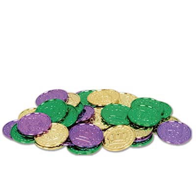 Mardi Gras coins- plastic. Even though these coins may not be able to buy you a drink or anything, there are a neat accessory for a Mardi Gras celebration. Spread these out over the tables at your party for your guests to enjoy. Comes 100 coins per package.
