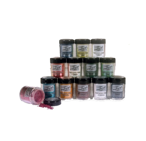Precious Gem Powder. Loose pure pigments, packaged in a mini shaker jar, can be used to create wet or dry designs. Use with Mehron Mixing Liquid for a water resistant metallic look.