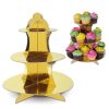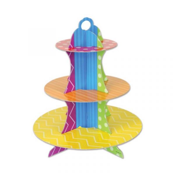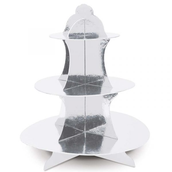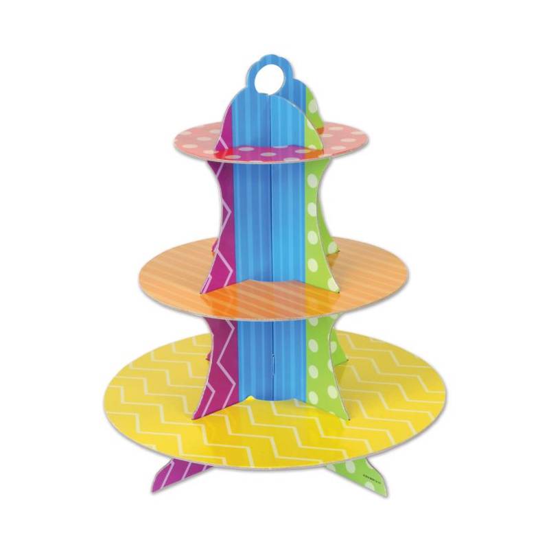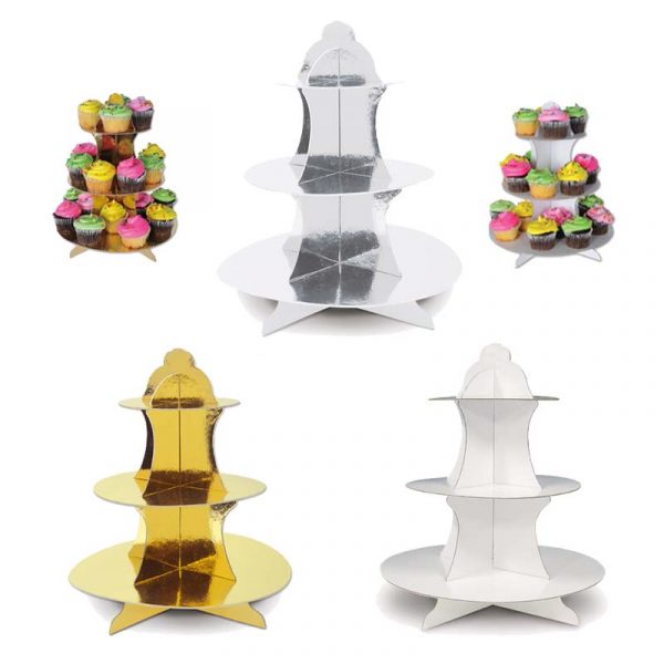 This sturdy metallic gold cardboard cupcake stand is 13.5″ tall. It is very easy to assemble. It holds up to two dozen (24) cupcakes. Great for the dessert table or bakery display case! Choose from four party colors!