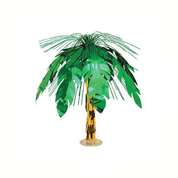 Metallic Palm Tree Centerpiece. Metallic palm tree cascade centerpiece is approximately 18″ tall, and sits in a clear acrylic stand. It makes a showy table centerpiece for a pool party or Hawaiian luau.