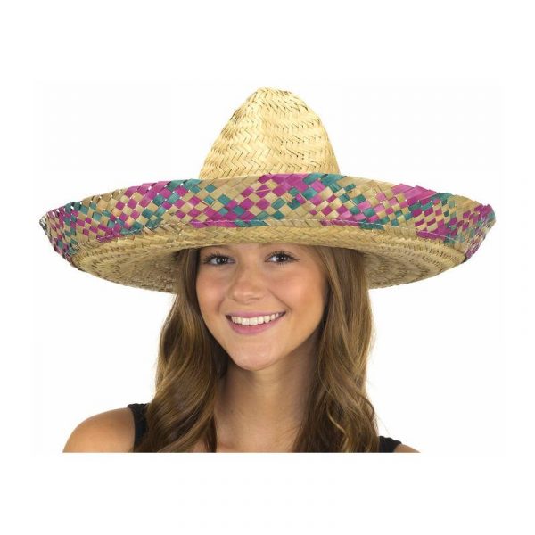 This wide brimmed Mexican Sombrero is woven to include a colorful multi-color border. Nothing compliments a Mexican costume like a sombrero.