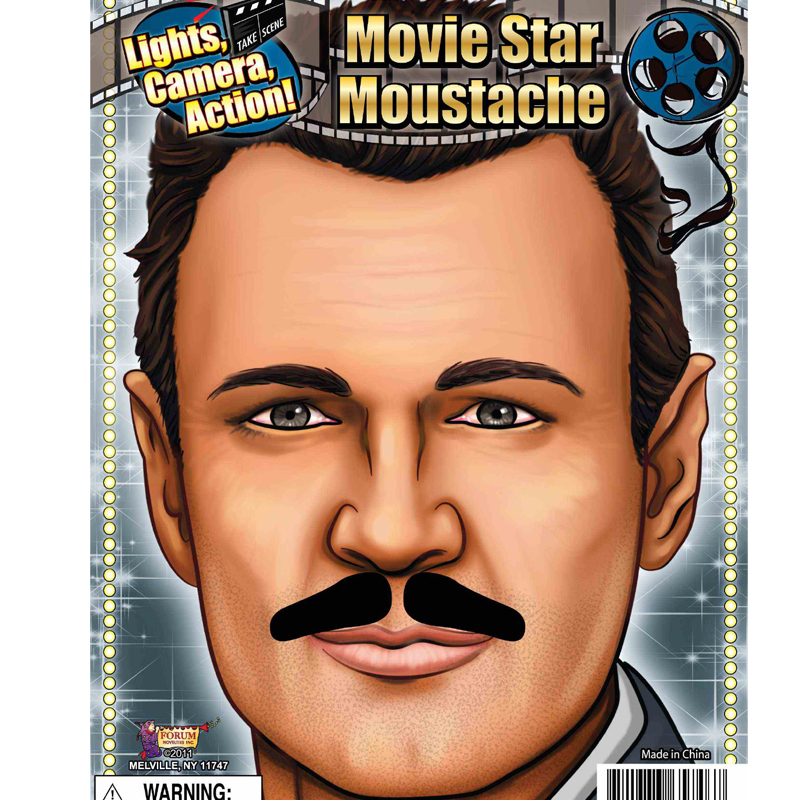 This “Movie Star” mustache: is black, peel and stick, and comes in two pieces so you can control where you want it to lay on your face