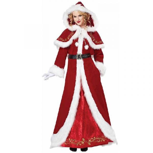Mrs. Claus Deluxe Adult Costume is perfect for the holiday season. Wear this for Christmas caroling. This is also great for helping Santa greet children as they tell him what they want for Christmas. This costume is soft, well made and ready to wear for many seasons to come. Wear this for Halloween, story telling, Christmas plays, and hosting events. This is a floor length coat with attached dress front. It has soft white fur lining the hem and cuffs. The hooded capelet is detachable and ties around your neck with pom poms. The black belt is also detachable and adjustable.