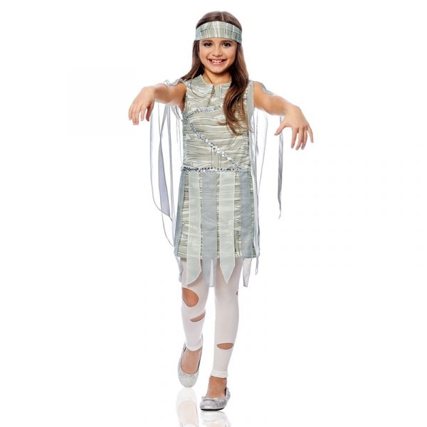 Mummy Child Size comes in small, medium and large. It features a gray striped dress, designed to look like mummy wrappings. Gauze-like material is attached as the sleeves and around the front like a belt. Sequins goes around the waist and zig-zags up the front. Elastic headband and leggings included.