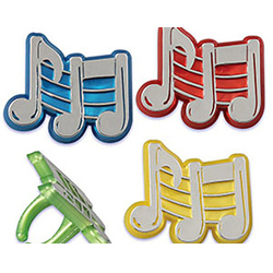Plastic Musical Notes Rings. Assorted colors of plastic rings with shiny silver musical notes and staff.