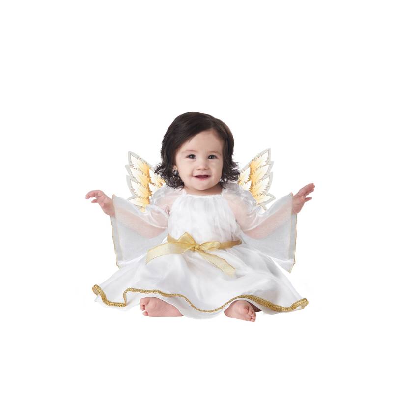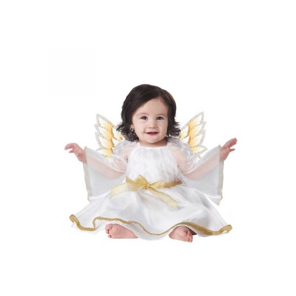 My Little Infant Angel is a most charming little cherub. This costume is a dress which features gold trim and a pair of printed foam wings. Soft foam wings attach to the back of the dress with hook and loop fasteners. Glitter feather print on the front side of the wings.