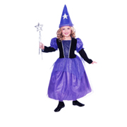 Your little one will feel special wearing this fancy Halloween Costume. The Mystical Mischief Sorceress includes the dress and hat. The dress is made of black panne velvet and purple satiny fabric with a lavender overlay dotted with silver glitter. The hat has a silver lame star on the front and a ruffle around the bottom.