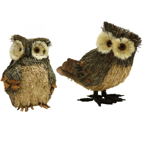 Natural Grass Owl comes in a 6″ and 12″ model. The 6″ sits upright with his head tilted. round circles of natural colored grass line the eyes. 6 pinecone-esque points create the wings. The 12″ stands on sturdy black feet and leaning forward with his head tilted. His wings and tail extend out the back.
