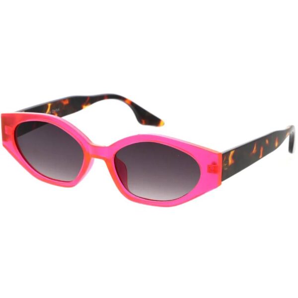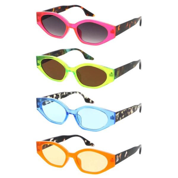 Neon frame oval lens sunglasses are all about making a bold statement with vibrant colors and a distinctive shape. The frames of these sunglasses are made from neon-colored plastic materials, such as bright pink, green, blue, or orange, which instantly catch the eye. The oval lenses add to the retro-inspired aesthetic, offering a unique twist on classic sunglass shapes.