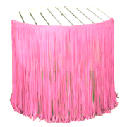This neon pink fringe table skirt is 12′ long. It can be used on a round table or on the front and sides of a rectangular table. It is bright pink.