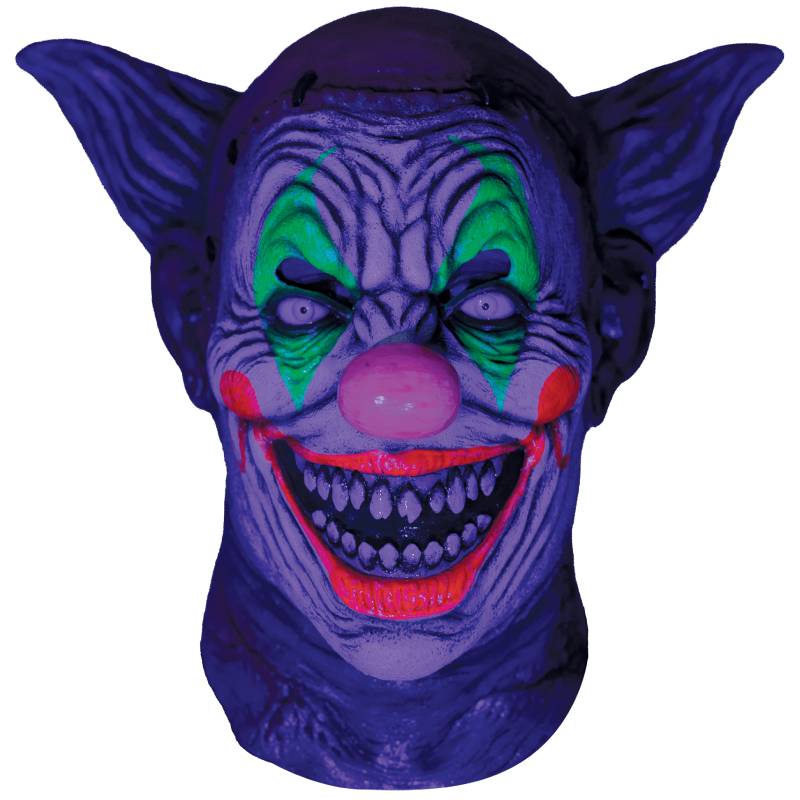 Neon Psycho Clown Latex Mask is a creepy clown mask with neon makeup, a big red nose, and gnarled surgery scars. Mask goes fully over the head and neck, and has holes to see that are above the mask’s eyes. Approx. 10 inches from top to bottom.
