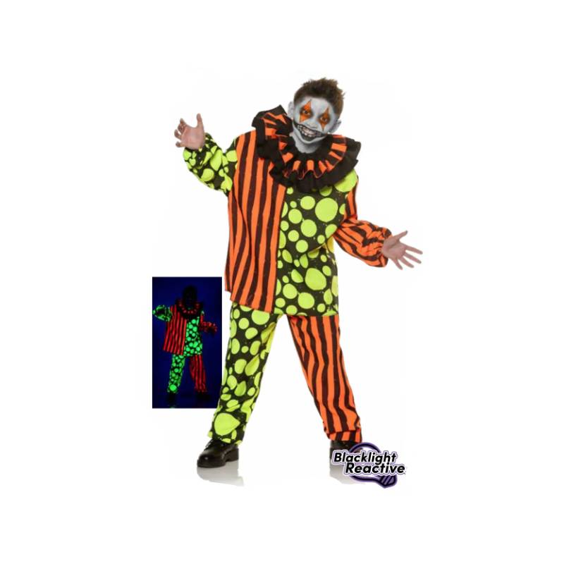 The Neon Terror Clown Blacklight Reactive is available in child’s size small and medium. It includes: 2-tone shirt, 2-tone pants, 3 layer clown collar.