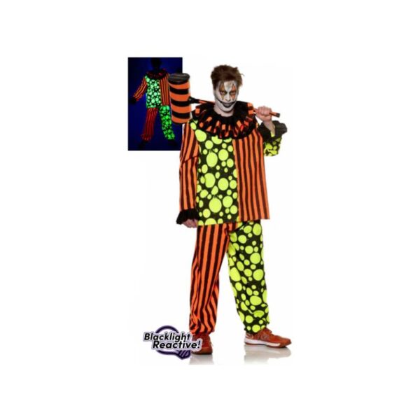 The Neon Terror Clown Blacklight Reactive is available in standard size, and xx-large.  It includes: 2-tone shirt, 2-tone pants, 3 layer clown collar.