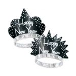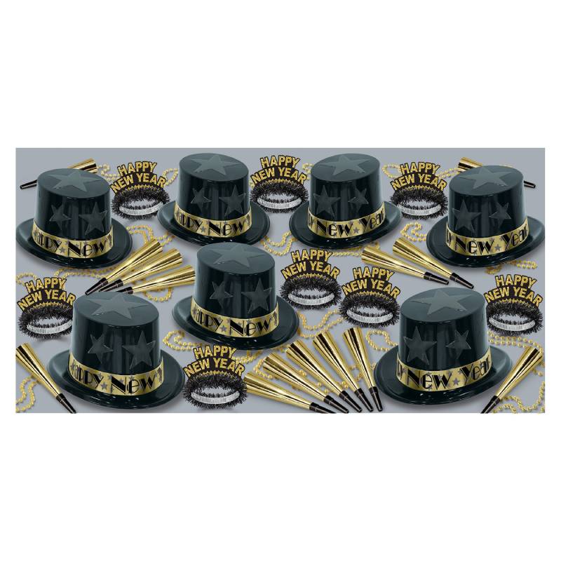 Gold Star New Years Eve Assortment contains: 25 – Plastic Star Top Hats with Printed Foil Band, 25 – Glittered Fringed Tiaras, 50 – 9″ Foil Horns, 25 – 33″ Party Bead Necklaces.