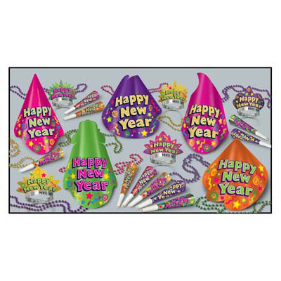 Color Brite New Years Party Kit for 10. This New Years party kit for 10 people includes: Hats, Tiaras, Horns, and Beads. Ring in the New Year with this fun party pack.