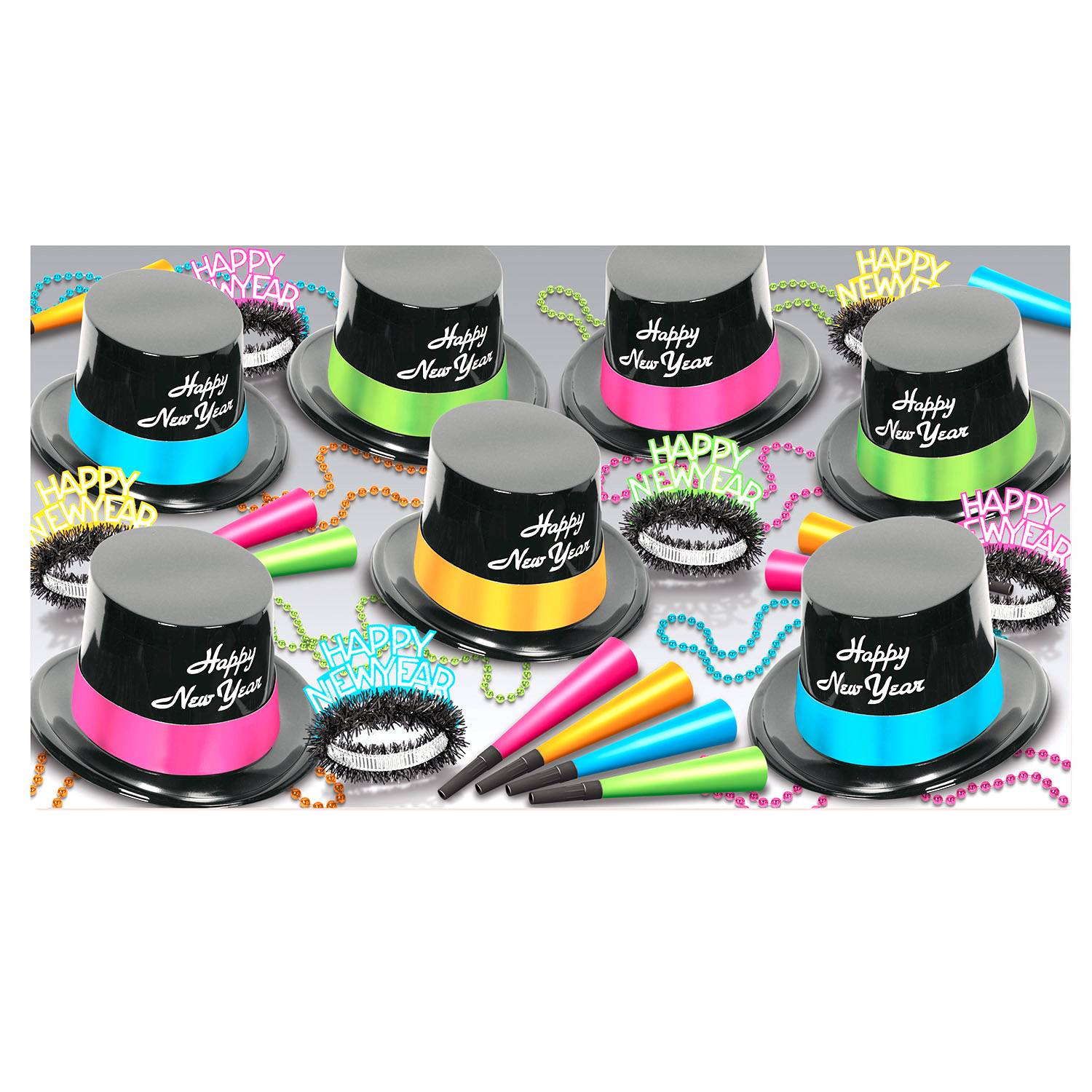 The Neon New Years Eve party pack assortment includes enough hats, tiaras, noisemakers and novelties for 50 people. It includes: