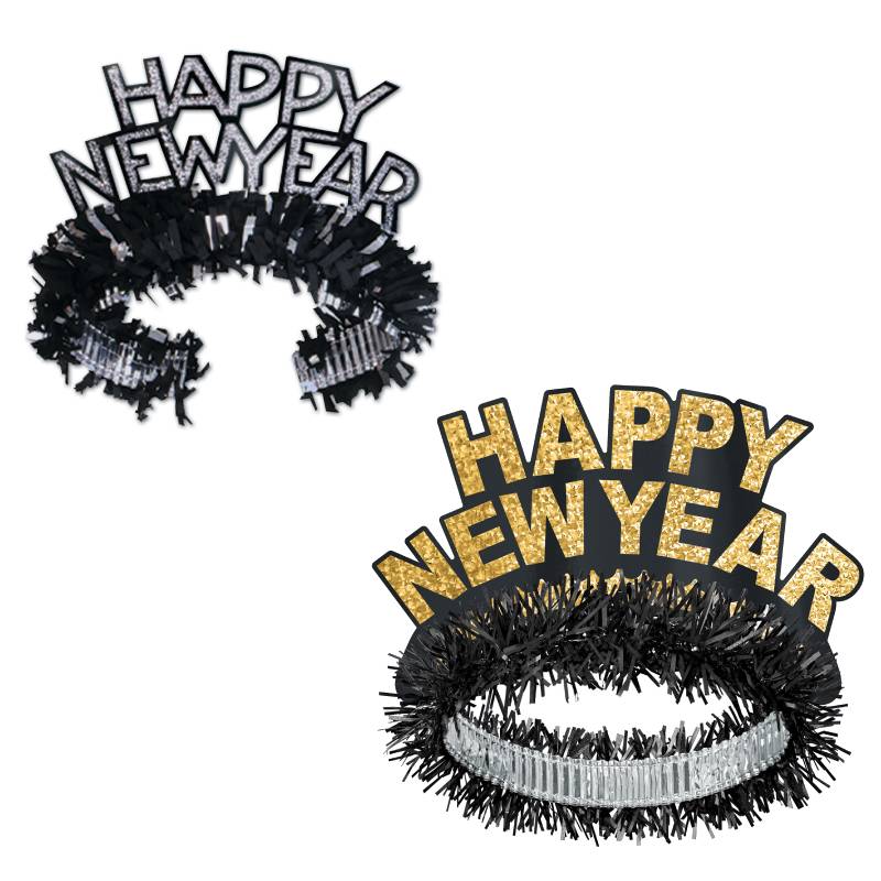 Happy New Year’s Eve Party Tiaras comes in pink, green, black/silver and black/gold. HAPPY NEW YEAR stands tall with glitter detailing. Metallic fringe covers a silver band that goes around your head.