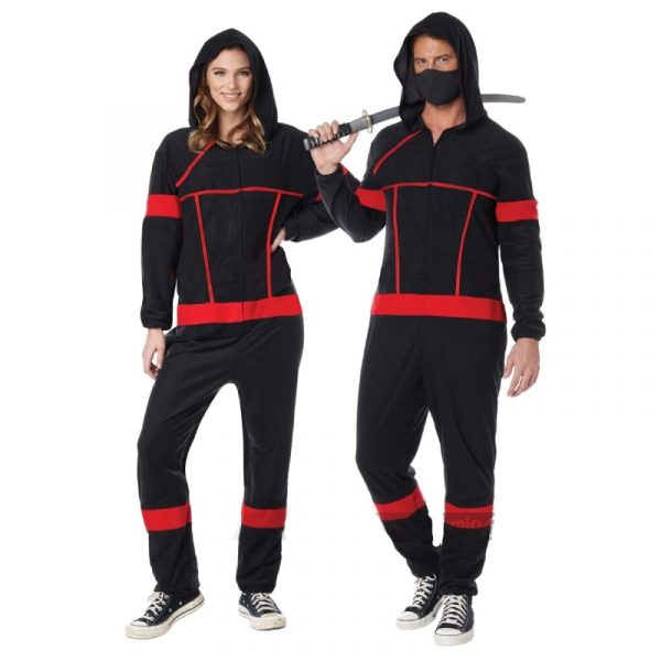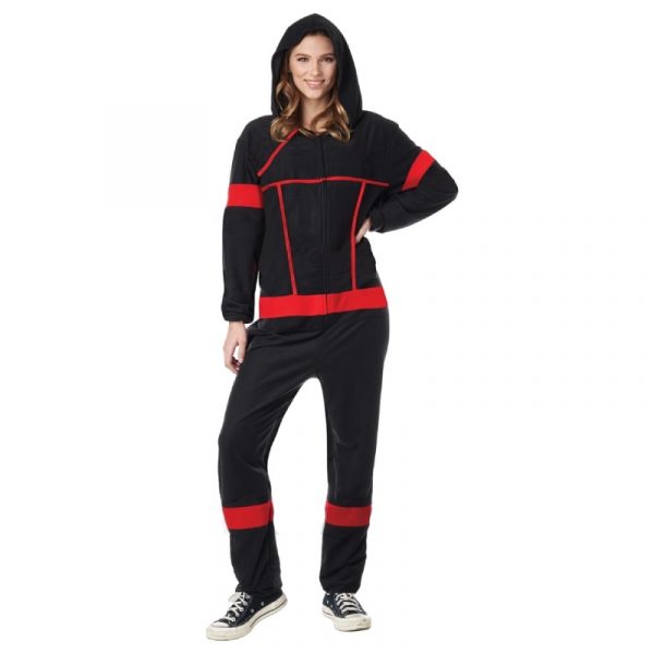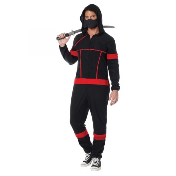Move stealthily in the night wearing Ninja Fleece Jumpsuit Unisex. This is the ultimate comfortable Halloween costume. Steal away with your significant other. This jumpsuit is decorated with red trim, giving the appearance of a shirt and pants. Not to worry, this jumpsuit is one piece and zips up the front for an easy costume change. Even better, it comes with a breathable fleece face mask. Wear your most comfortable pair of shoes and head into a night of easy, casual fun. It comes in three adult unisex sizes: Small, Medium, Large. Wear this for Halloween and themed parties.
