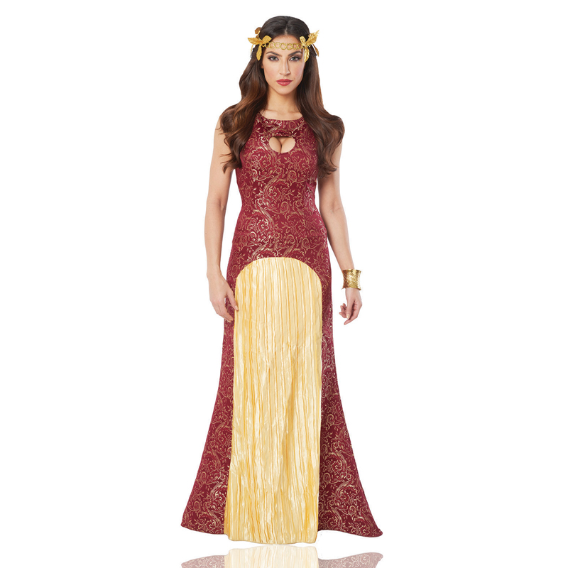 Noble Lady is a long red dress with gold detailing swirling throughout the dress. The top has a key hole cut out. The dress is fitted through the hips. It has a gold metallic inlay with an accordion design to give you room to walk. A gold leaf headpiece is kept in place with elastic.