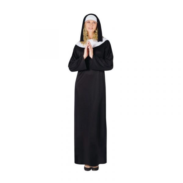 Nun Adult Size Costume is a full length gown with an attached collar. The headpiece has a white elastic strap. Fits up to size 14.