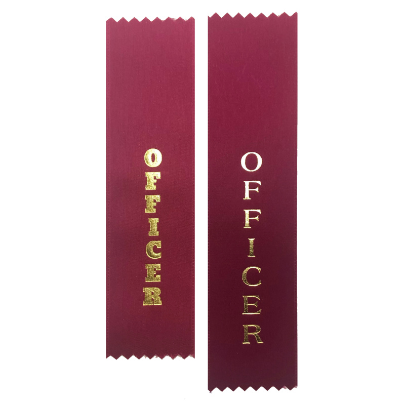 This flat award ribbon is a wine color with gold print. It comes in two styles: long (measures approximately 2″ wide by 8″ length) or short (measures approximately 2″ wide by 7″ length). It can be fastened with a straight pin or safety pin; these are not included.