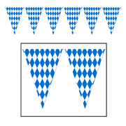This Oktoberfest Pennant Banner is 17″ X 120′. It has the blue and white diamond pattern on each pennant.