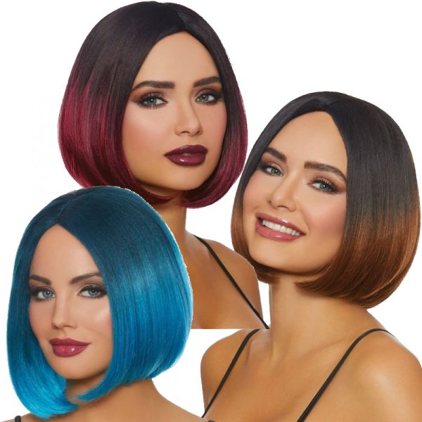 Adjustable, ready to wear, washable, wig feels like human hair. Ombre Bob Wigs are available in Brunette/Caramel, Black/Burgundy, Steel Blue/Bright Blue.