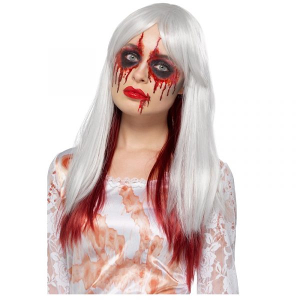 Wear a deluxe Ombre Wig White Red – Blood Drip Deluxe Styleable wig. Features two-toned, heat resistant, styleable fibers. Fits most adults and older youth.