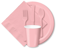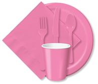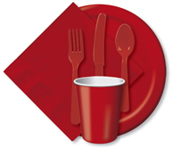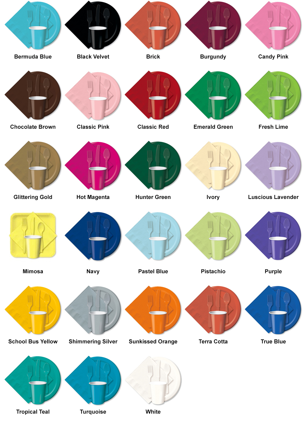 Color Coordinated Tableware, Table covers, Plates, Cups, Napkins, Forks, Knives, Spoons, Table skirts, Table Roll. Paper and Plastic Solid Color Tableware: Table covers / Tablecloths, Utensils, Beverage Napkins, Lunch Napkins, Paper Napkins, Paper Hot/Cold Cups, Plastic Cups, Lunch Plates, Dinner Plates, Dessert Plates, Salad Bowls, Place Mats, Table Skirts – 26 Colors of paper and plastic ware.