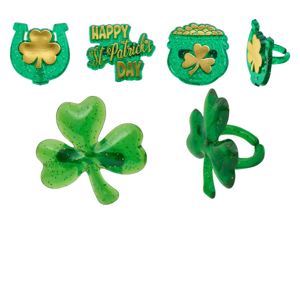 Use for cupcake decorations! Give green Plastic Foil St. Pats Rings and a Glitter Shamrock Ring to each guest at your St. Patrick’s Day event or parade. Small ring fits most children.