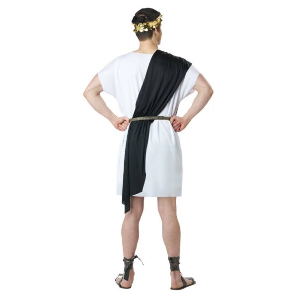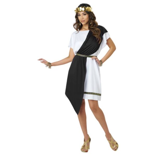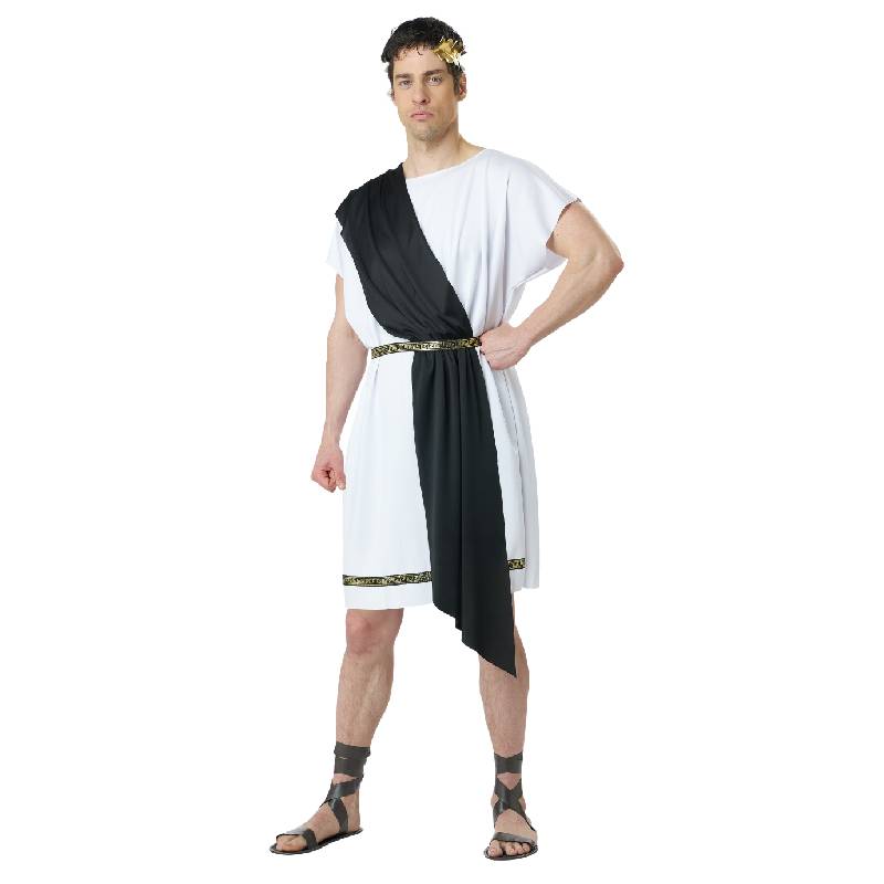 Party Toga Adult Costume comes with two variations in one package! This is an excellent costume if you have multiple parties to attend. It includes a tunic, a belt, 2 shoulder shawls, and a gold leaf elastic headband. The shoulder shawl comes in either red or blue. The gold leaf headband is elastic so it fits multiple head sizes. The belt fastens securely to your waist. Wear this to Roman inspired parties, themed parties at school, home, or an event center. Wear Party Toga for Halloween, productions, reenactments and more.