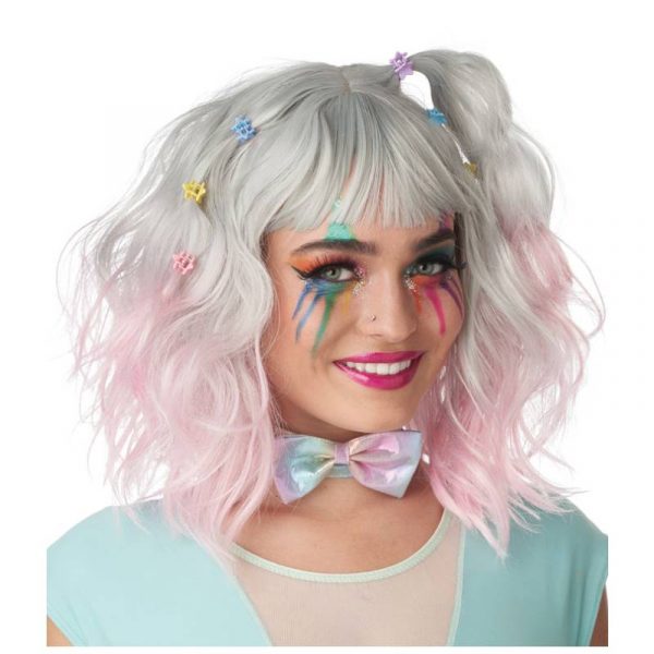 Pastel Textured Long Bob is ombre gray to blue gradient. It includes 2 yellow, 2 purple, 2 blue, and 2 pink hair clips.