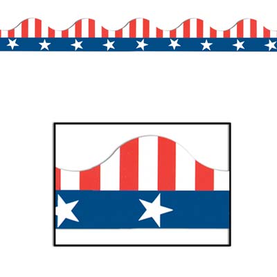 Patriotic border trim. Decorate your house or a classroom for a patriotic holiday. Use the patriotic border trim to decorate around windows or bulletin boards. Comes 12 pieces per package for a total of 37 feet of border.