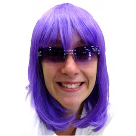 Peggy Sue Purple Wig. This is a classic ladies medium length costume wig. The bright purple wig is certain to make a statement and brighten up any Halloween costume.