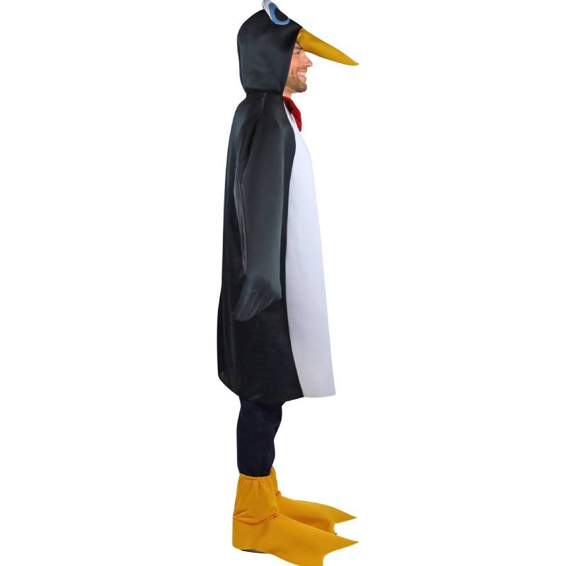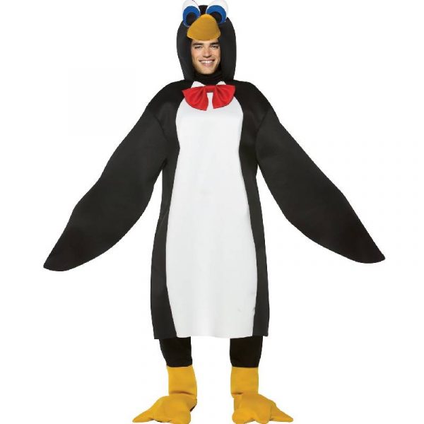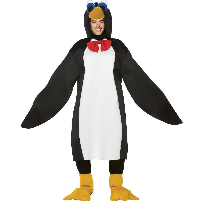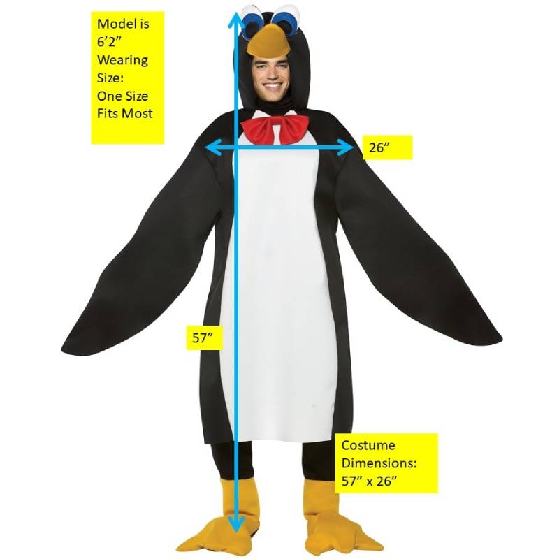 Waddle your way to good times in Penguin Costume Adult Standard. This Adult penguin costume features a lightweight polyester tunic with a red bowtie. It has an attached hood with beak and eyes. The flippers are the sleeves that have holes to allow hands to come through. The costume would not be complete without flipper shoe covers. Eat, drink, and party with ease. Fits most adults. Wear this for Halloween, themed parties throughout the year, and theatrical performances.