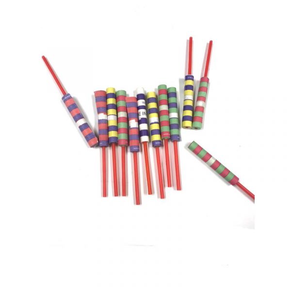 Assorted Striped Paper Chinese Yo-Yo measures about 6″ tall before stretching it out. Attached to a red plastic stick.