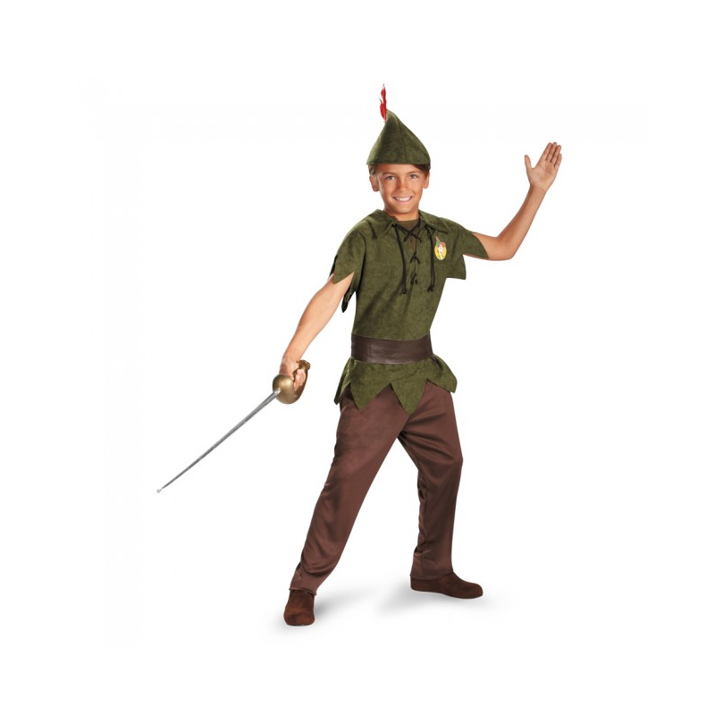 Peter Pan for children. This is the official Disney Classic Peter Pan costume. Wear this to pretend fly to Never Never Land! Parents, play to part and wear a captain’s hook and a long curly black wig.