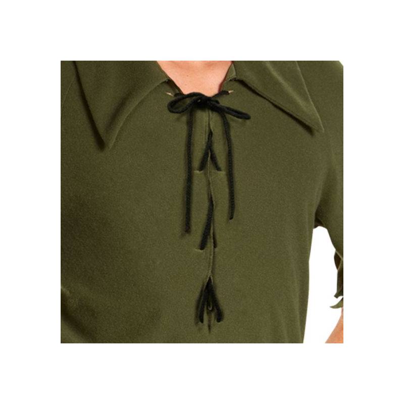 - Tunic and Trousers: The costume includes a green tunic-style shirt with a V-neckline and short sleeves. The tunic features jagged edges along the sleeves and hemline to mimic the appearance of leaves or a rustic, forest-dwelling style. The trousers are brown made from comfortable and durable fabric suitable for various activities.
