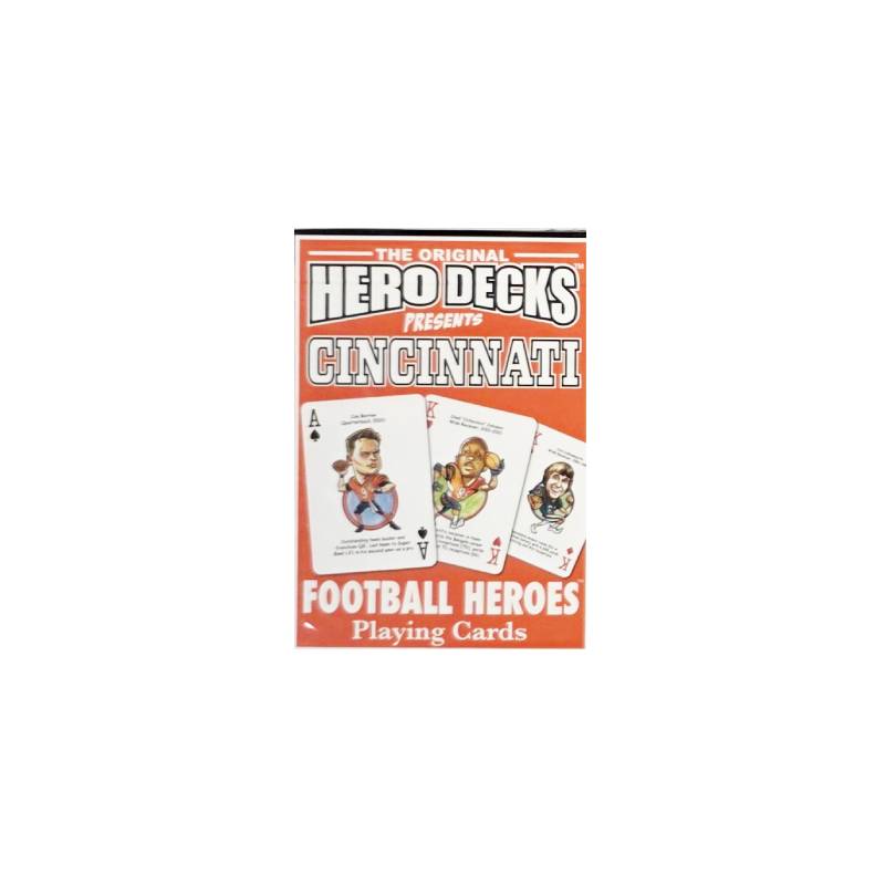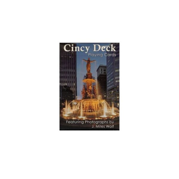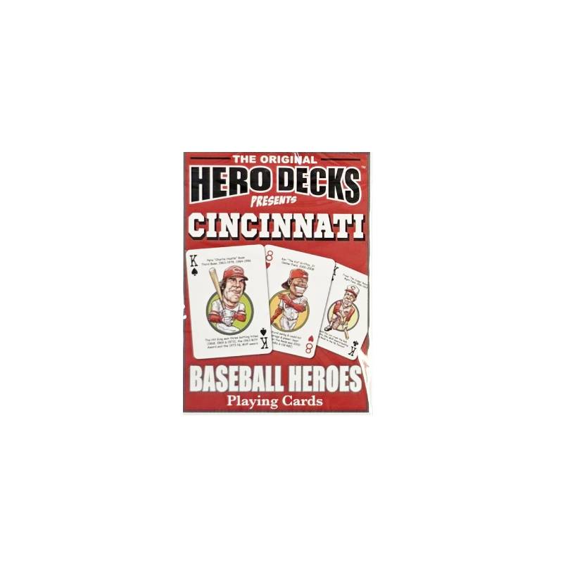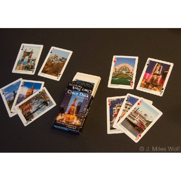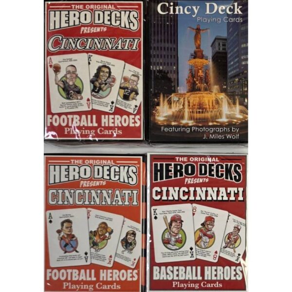 Hero Decks Cincinnati Playing Cards is a regular size deck of cards. Each one has a different photo of something in Cincinnati and a caption underneath to tell you what it is.